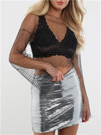 Glamorous Women’s Silver Sequin Mini Skirt. This sparkling mini length skirt features an eye catching sequin fabric that’s sure to make a statement and turn heads. A perfect party piece!